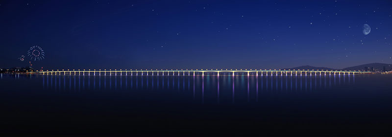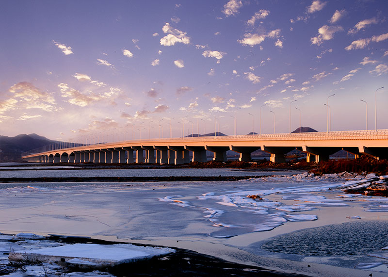 大橋工程分為主橋、預制段引橋和北側現澆段引橋,其中主橋長500米,主跨為120米的大跨變截面預應力混凝土連續(xù)箱梁,是當時東北地區(qū)跨度最大的連續(xù)梁跨海橋。大橋的設計結合了使用和景觀的雙重功能,作為普灣經濟區(qū)核心位置的地標性景觀,獨具特色的夜景設計使其成為經濟區(qū)一道亮麗的風景線。